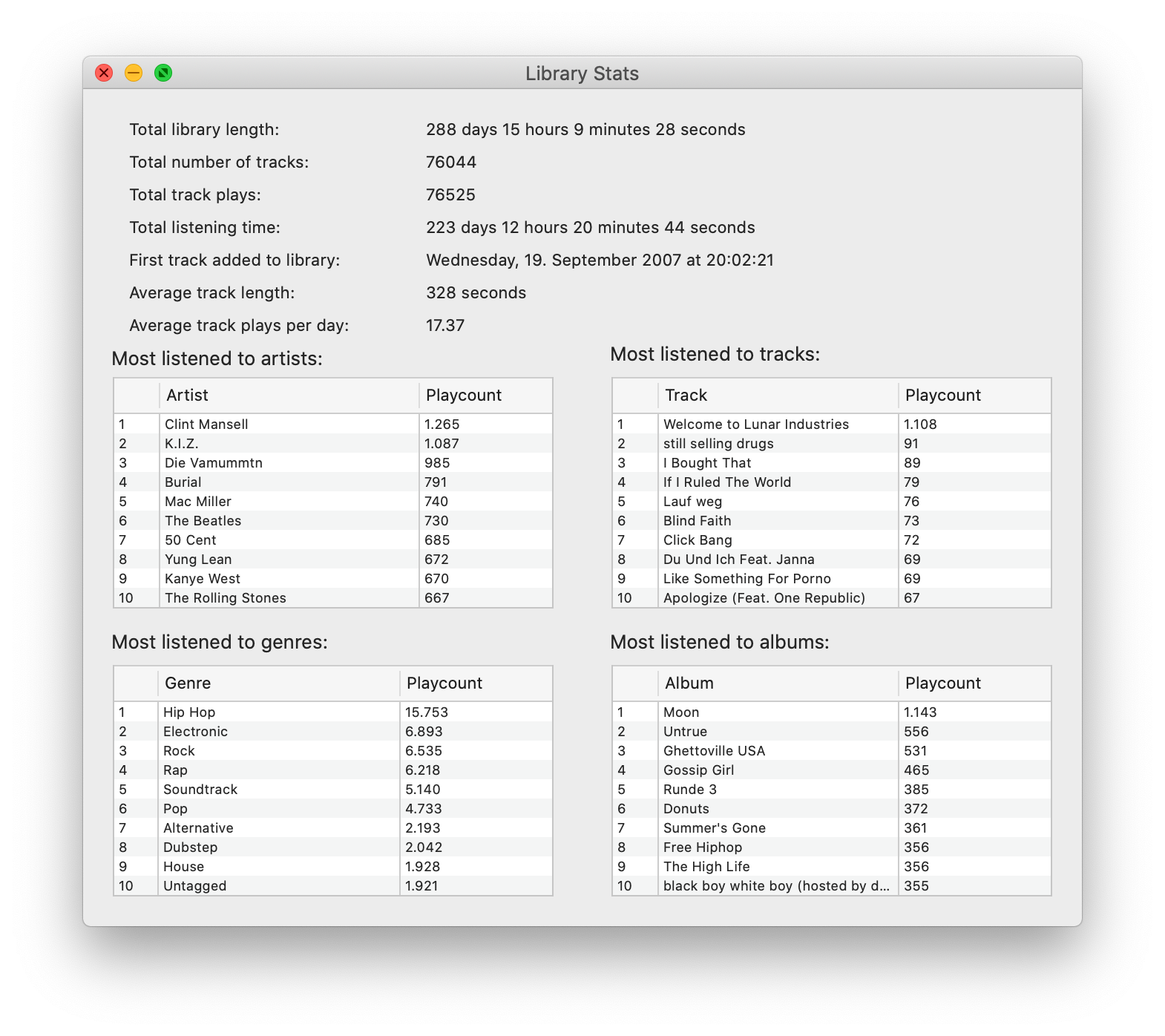 Until today, when I switched from macOS Mojave to Catalina and Music.app messing up my library. It wasn't opening it any more and was asking for the "Library File". After looking into the directory where said library was supposed to be I only saw years of different iTunes libraries, directories for Podcasts, Audio-books, iTunes libraries from 2011 and other cruft. I decided to clean up this mess and look for something new. On top of that my trusted last.fm scrobbler NepTunes stopped working.