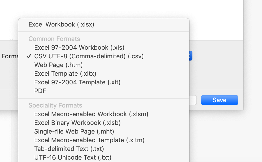 On top of that: This behavior is different between Microsoft Excel for Mac: Version 15.12.3 and Microsoft Excel for Mac: Version 16.28. I tried to replicate the issue on Version 15 at first, exported the CSV and the BOM control characters weren't inserted. I then upgraded and saw that they added the UTF-8 CSV option additionally to the "normal" CSV export which is now buried all the way at the bottom of the save dialog (Not even pictured in this screenshot) and the default one is UTF-8 with the additional BOM characters.