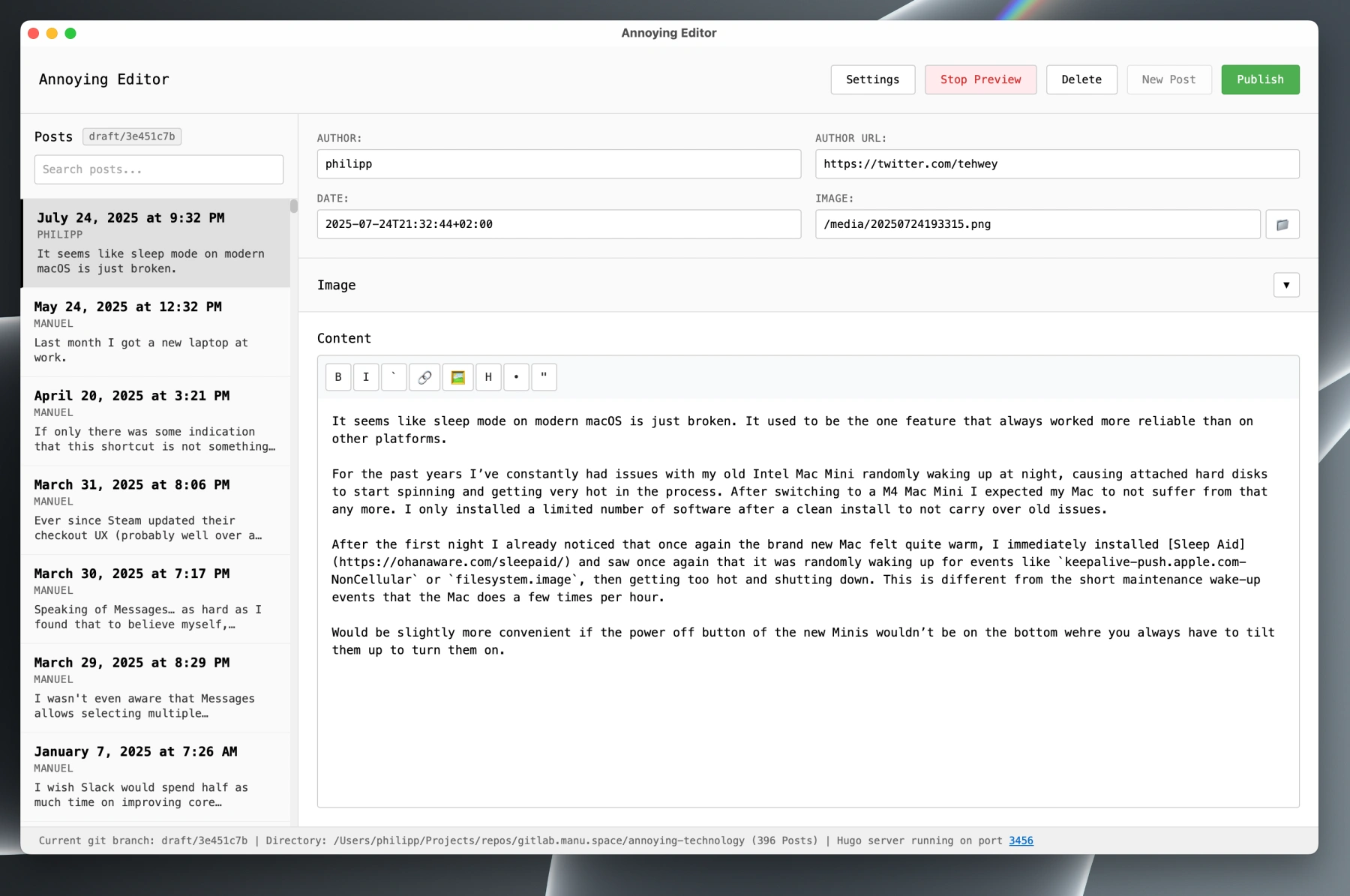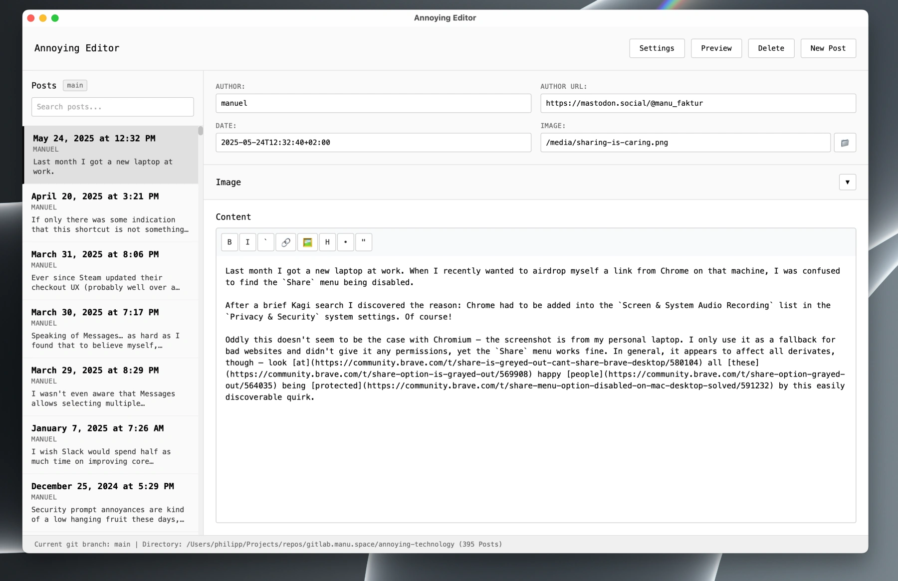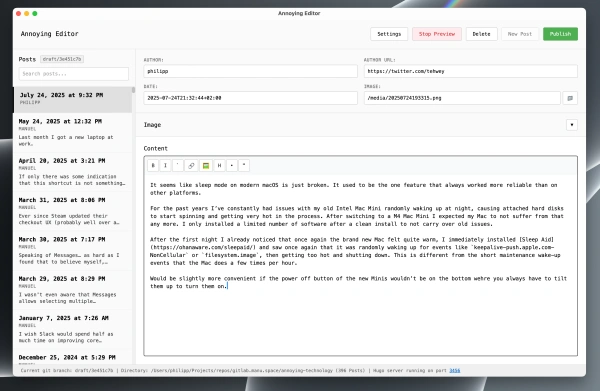 In times of AI it should be relatively simple to just build a custom GUI app just for this task and in the style of the blog. This turned out to be true, even though it would still take a bit of work and extra prompting to make everything work a bit smoother.