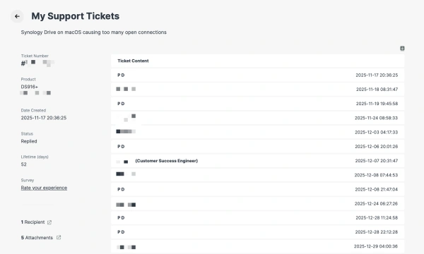 On the next day I've already heard back from them with some instructions on how to submit standardized debug logs from the Synology Drive client and server. I chalked this up to the usual automated process and didn't think much of it. I submitted the logs and a few days later, to my surprise, the ticket got escalated to a developer.