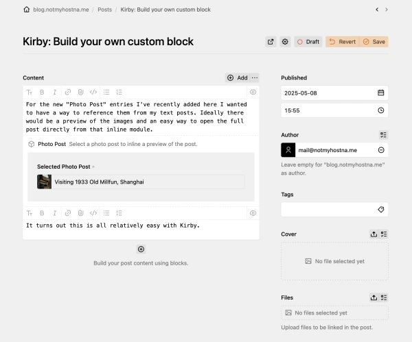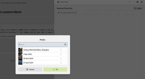 For the new "Photo Post" entries I've recently added here I wanted to have a way to reference them from my text posts. Ideally there would be a preview of the images and an easy way to open the full photo post directly from that inline module.
