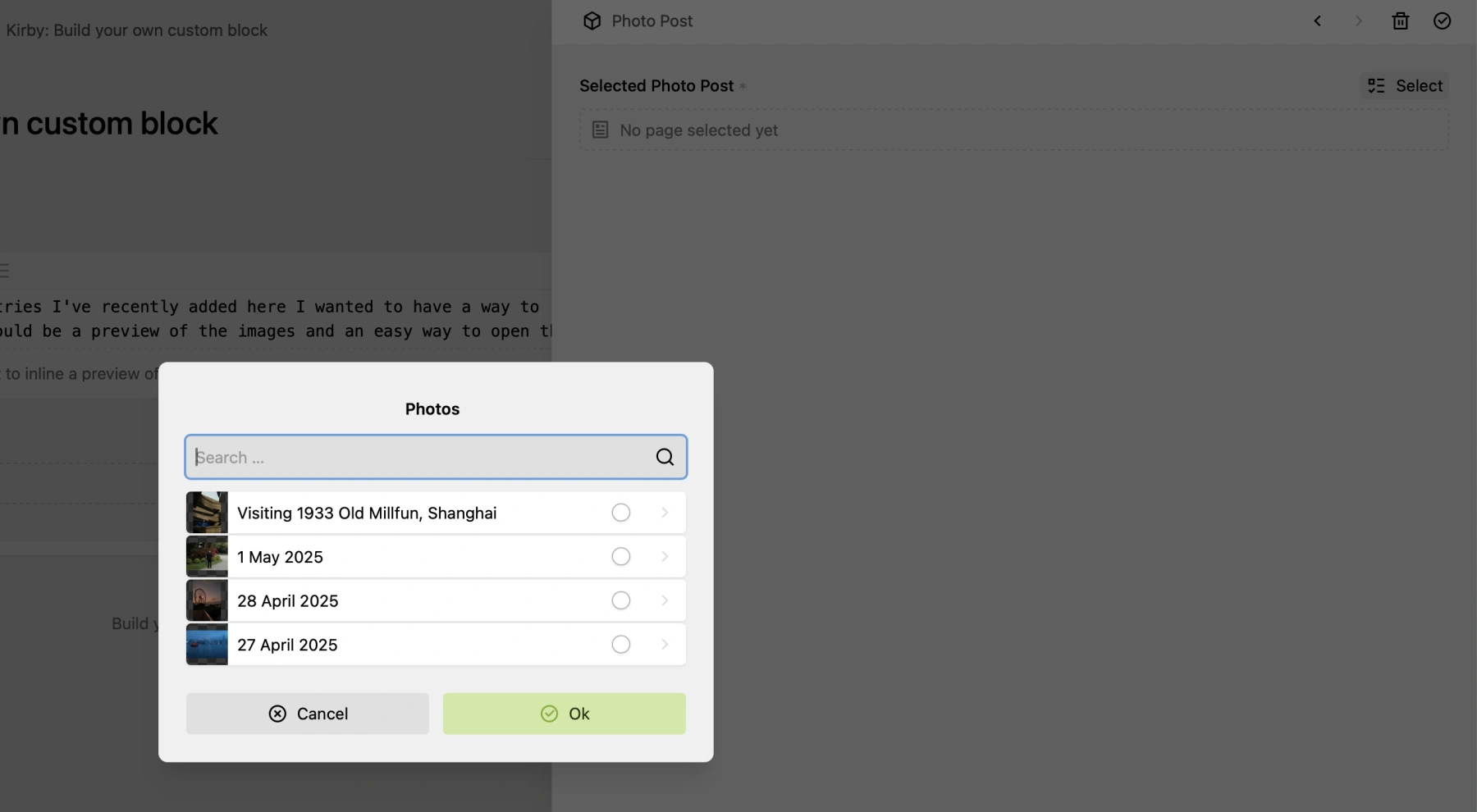 Here we create a new block type, the query prepopulates the select field with our list of photo posts.