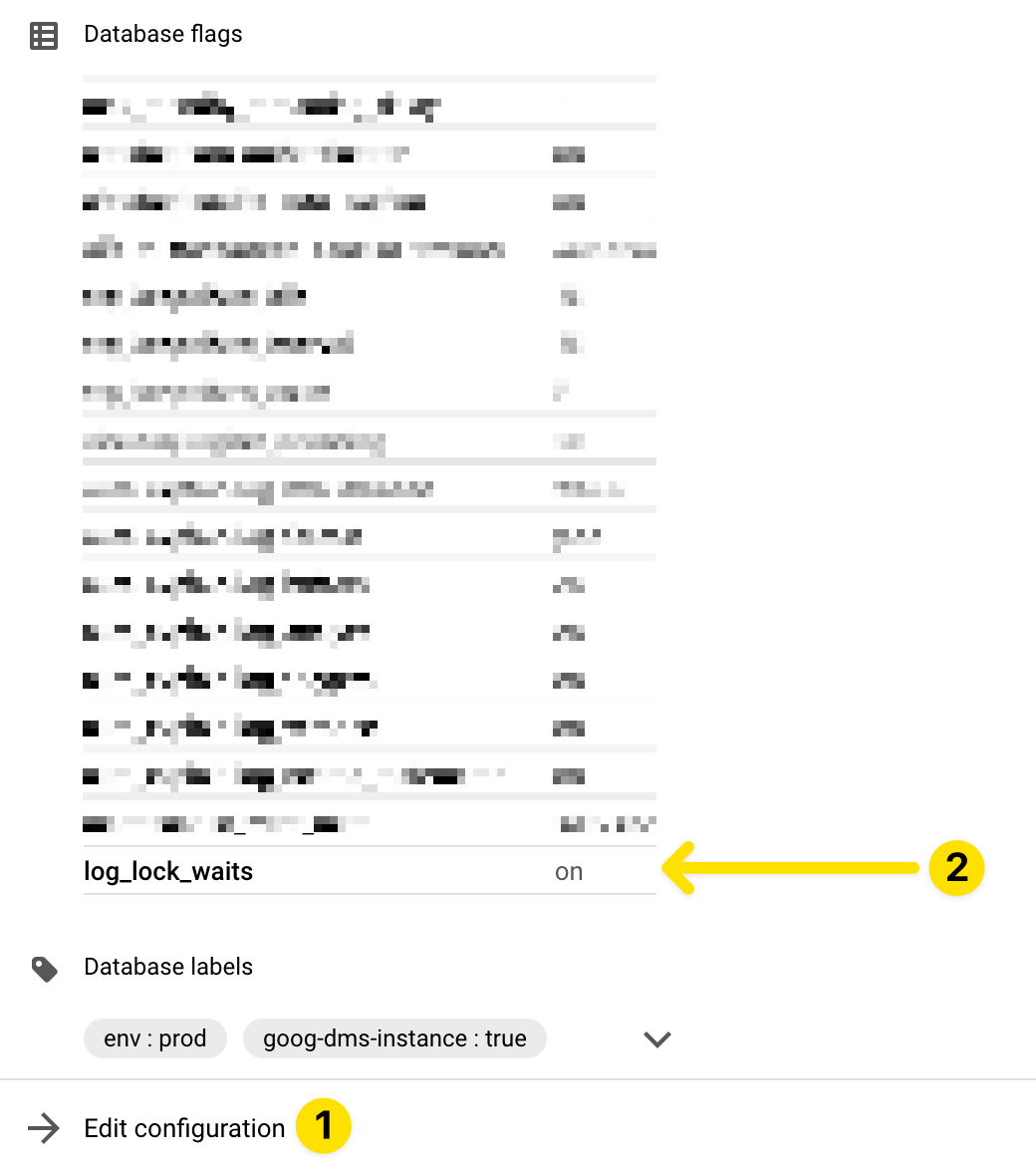 The first step was to enable log_lock_waits, one of the runtime flags. In Cloud SQL that’s just one of the default database flags you can flip to true. It doesn’t require a restart.