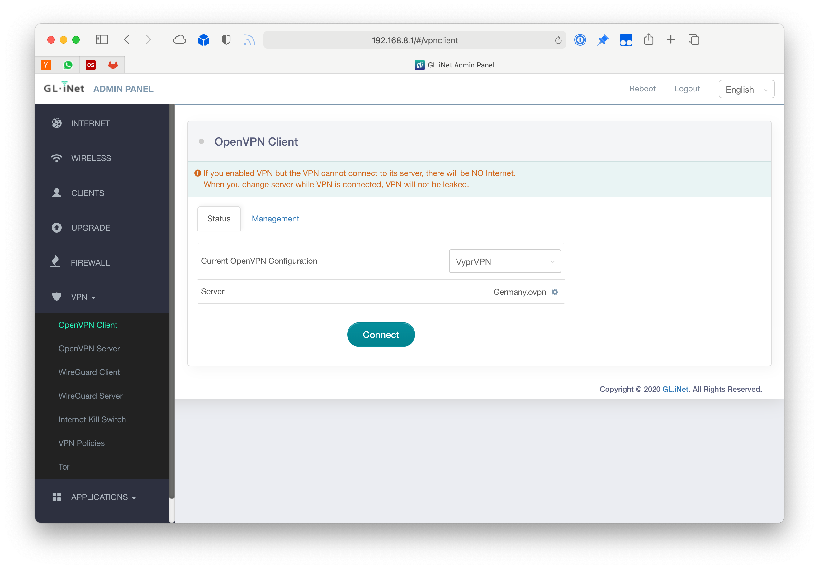 This is the feature I bought the device for, you can just import your WireGuard or OpenVPN profiles and connect. Then if enabled all traffic going through the Beryl will get passed through the VPN.