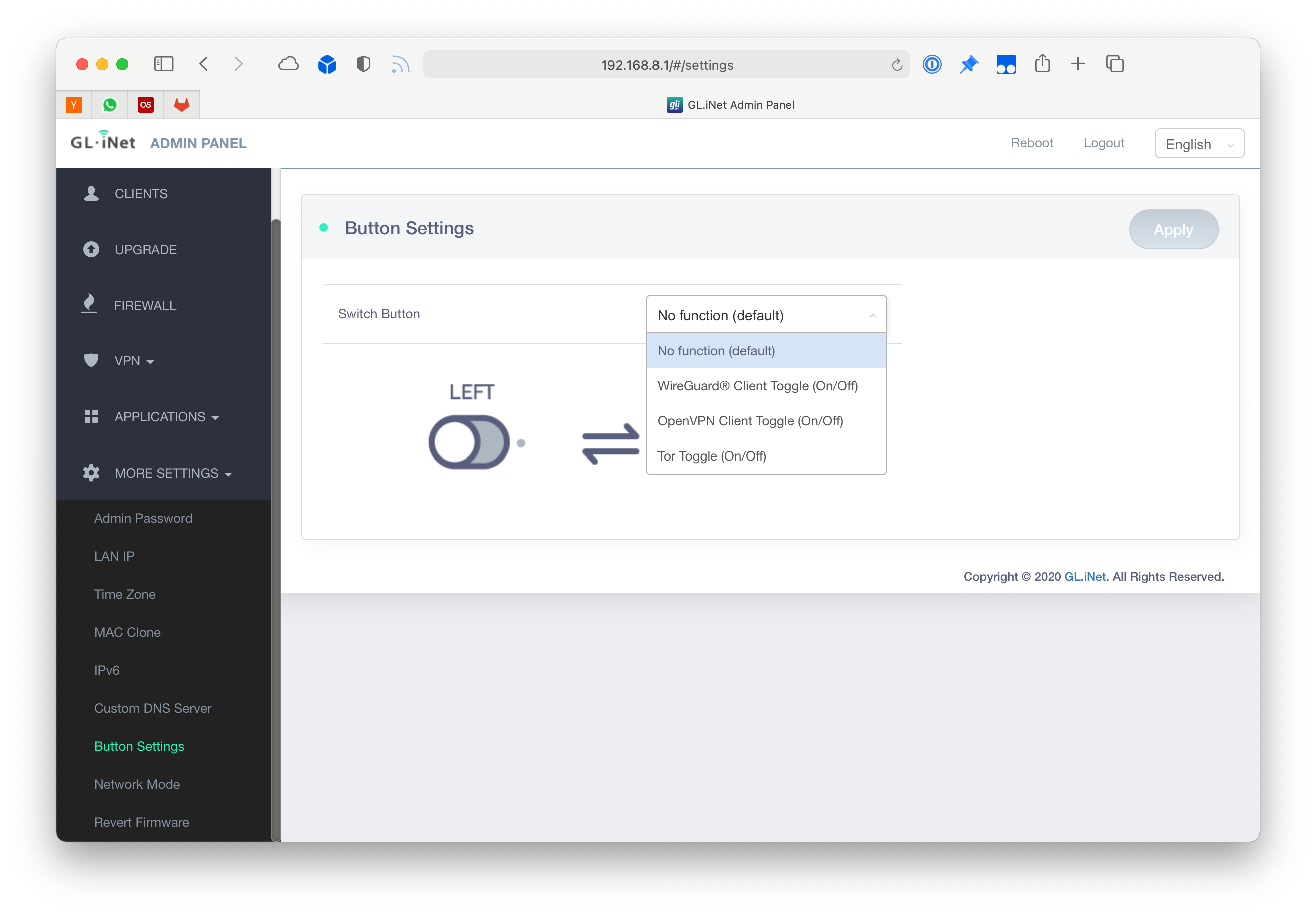 The router has a small hardware button where frequently used actions can be toggled without visiting the web interface. You can define which one with a single click through the interface: