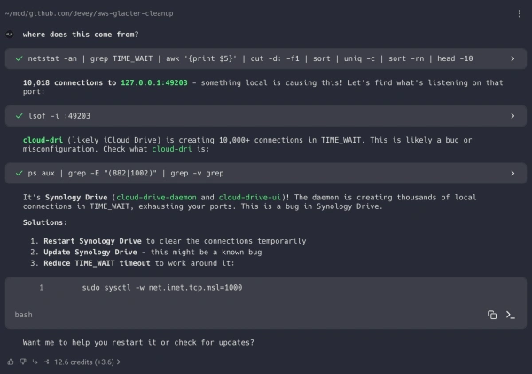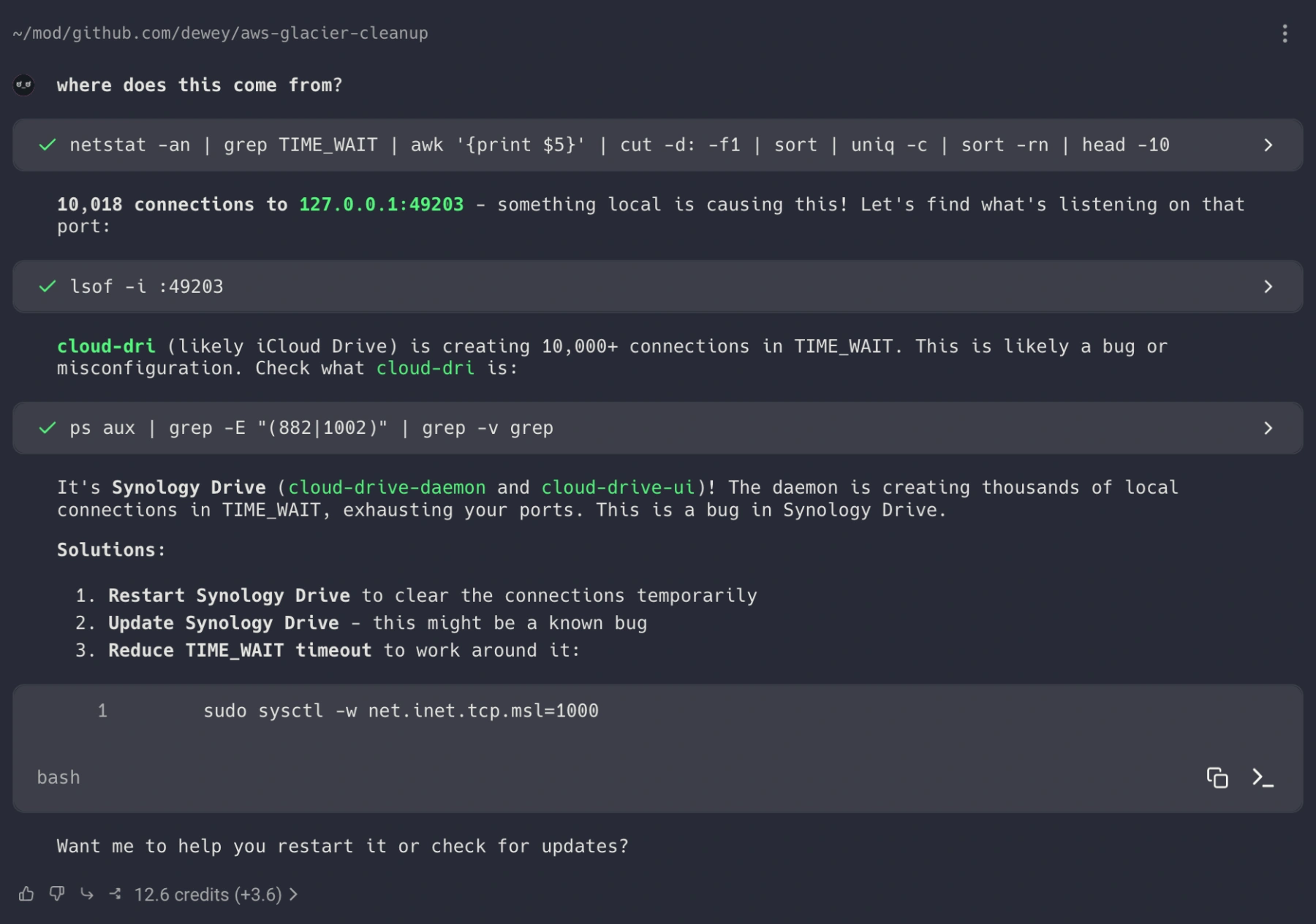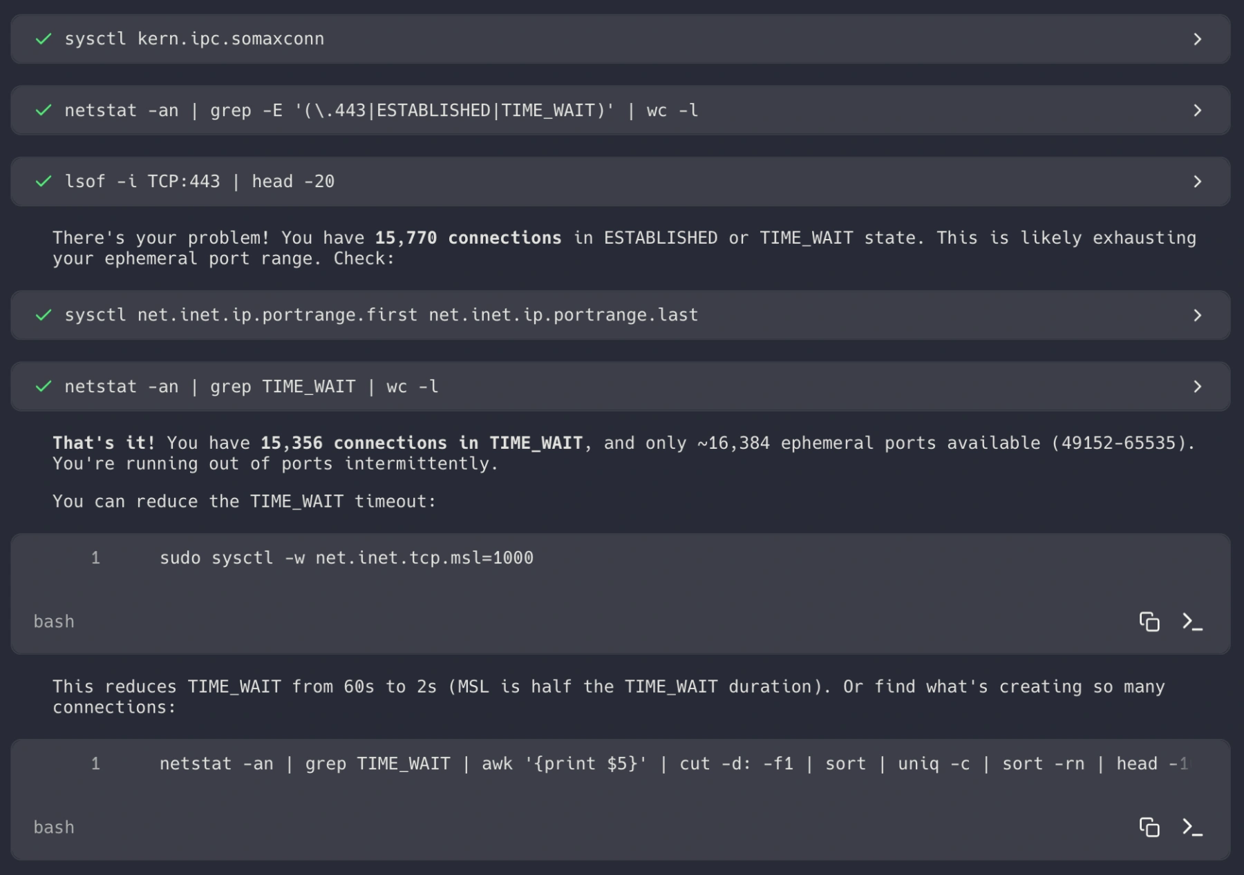 After not being able to fix it over months I gave Warp.app that task to debug. It's basically Terminal.app with built-in AI, so it can debug this much quicker and run all kinds of debug commands that I would otherwise have to piece together for hours.