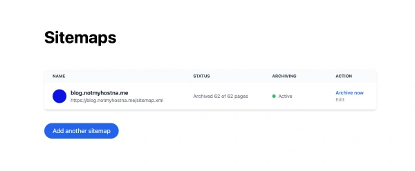 For that I'll also do some more work soon to check the "Last modified at" header of sites to skip archiving them again, having a hard limit on how many entries you can have in your sitemap and to make it really clear that the use case is personal or very niche sites and not popular pages with millions of sitemap entries.